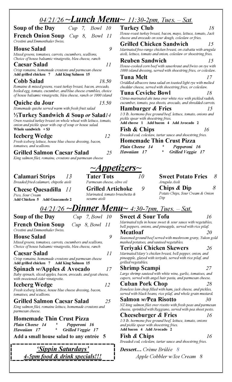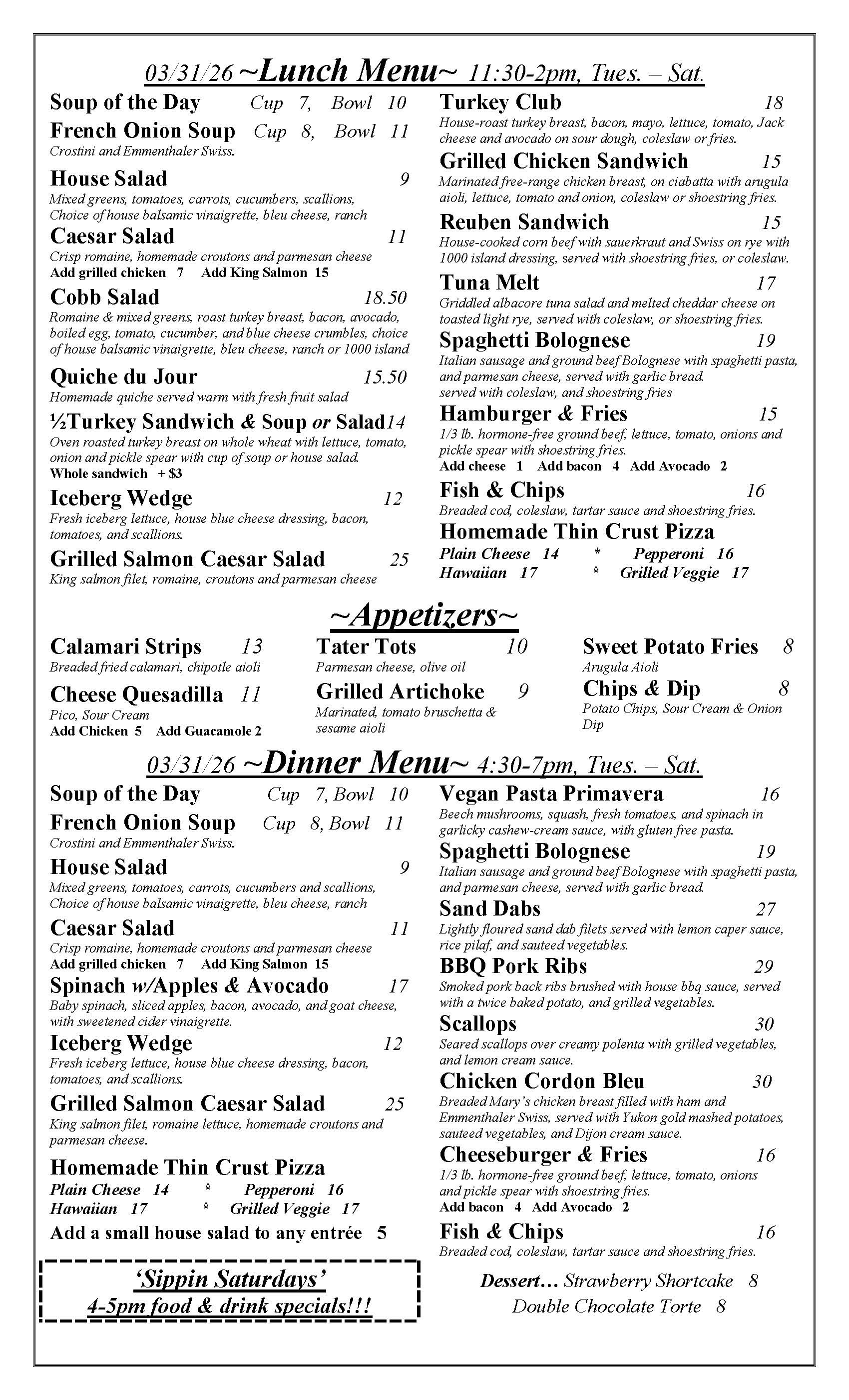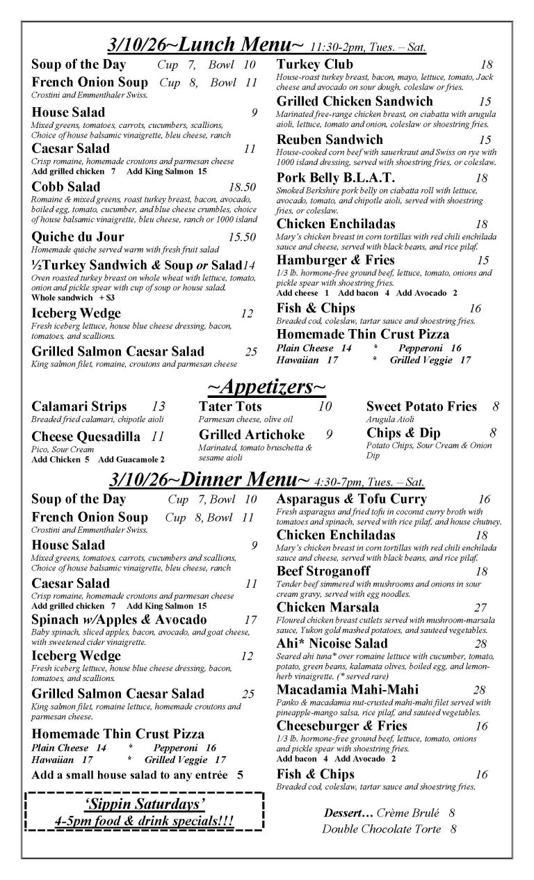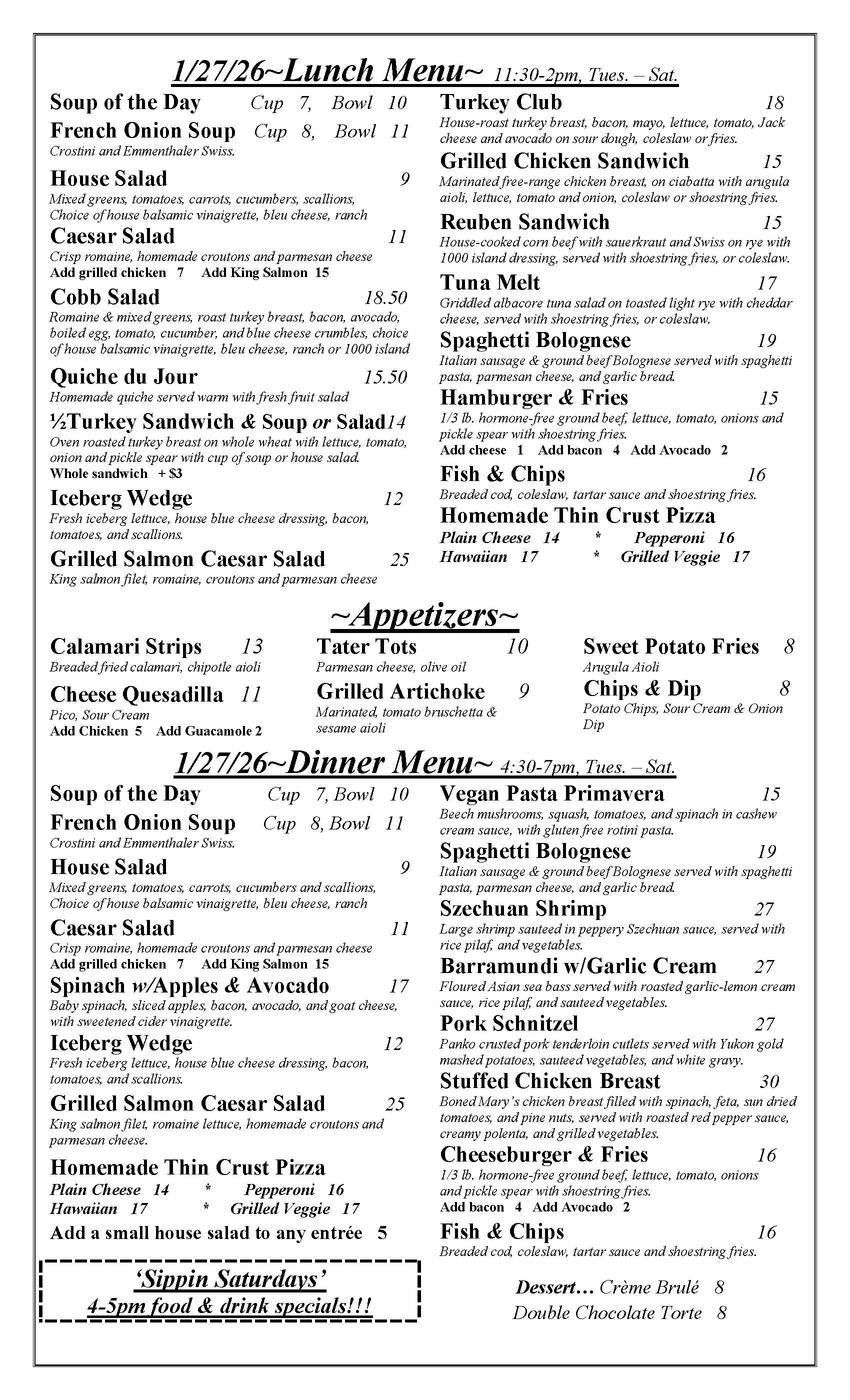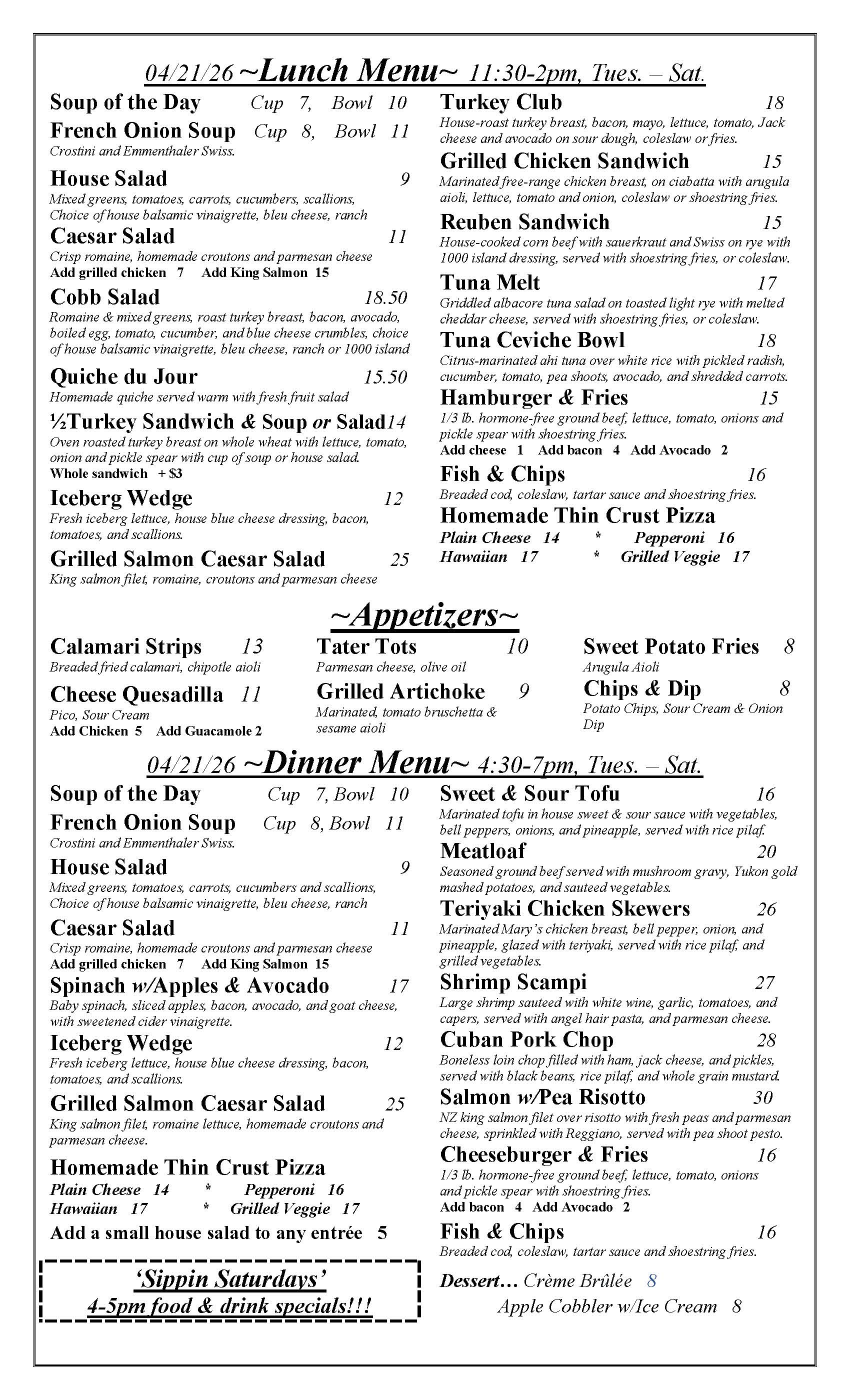 Open Tuesday through Saturday for lunch and dinner and Sunday for brunch. Food may also be ordered “to go” for pick-up from the Dining Room or you may request delivery to your unit at no additional cost.