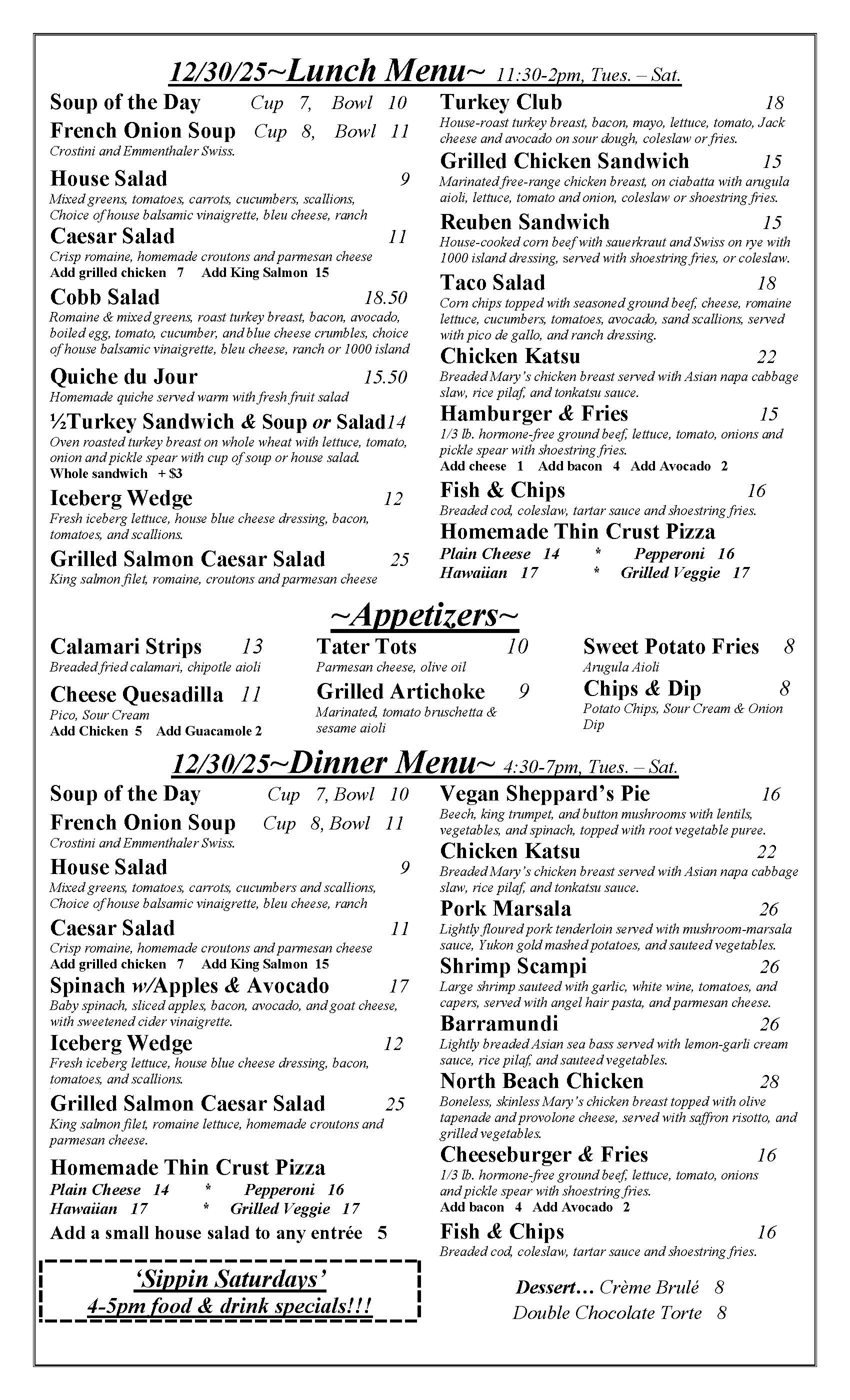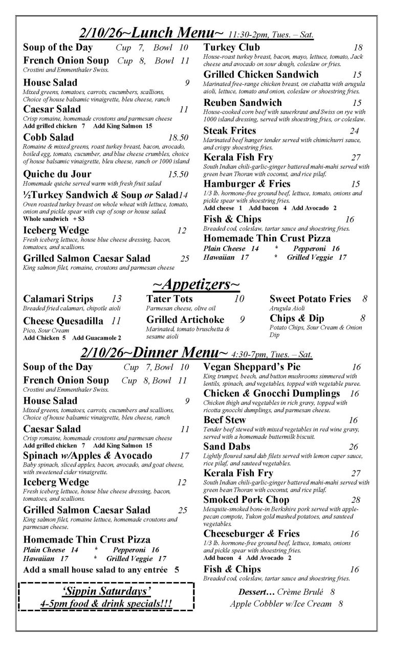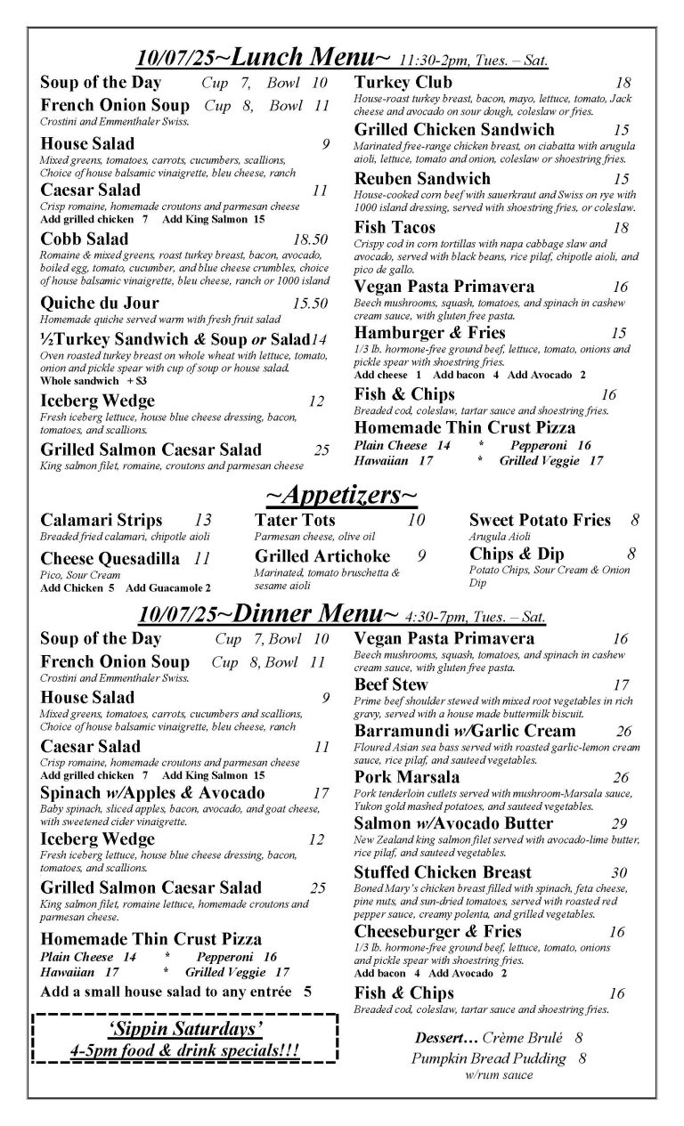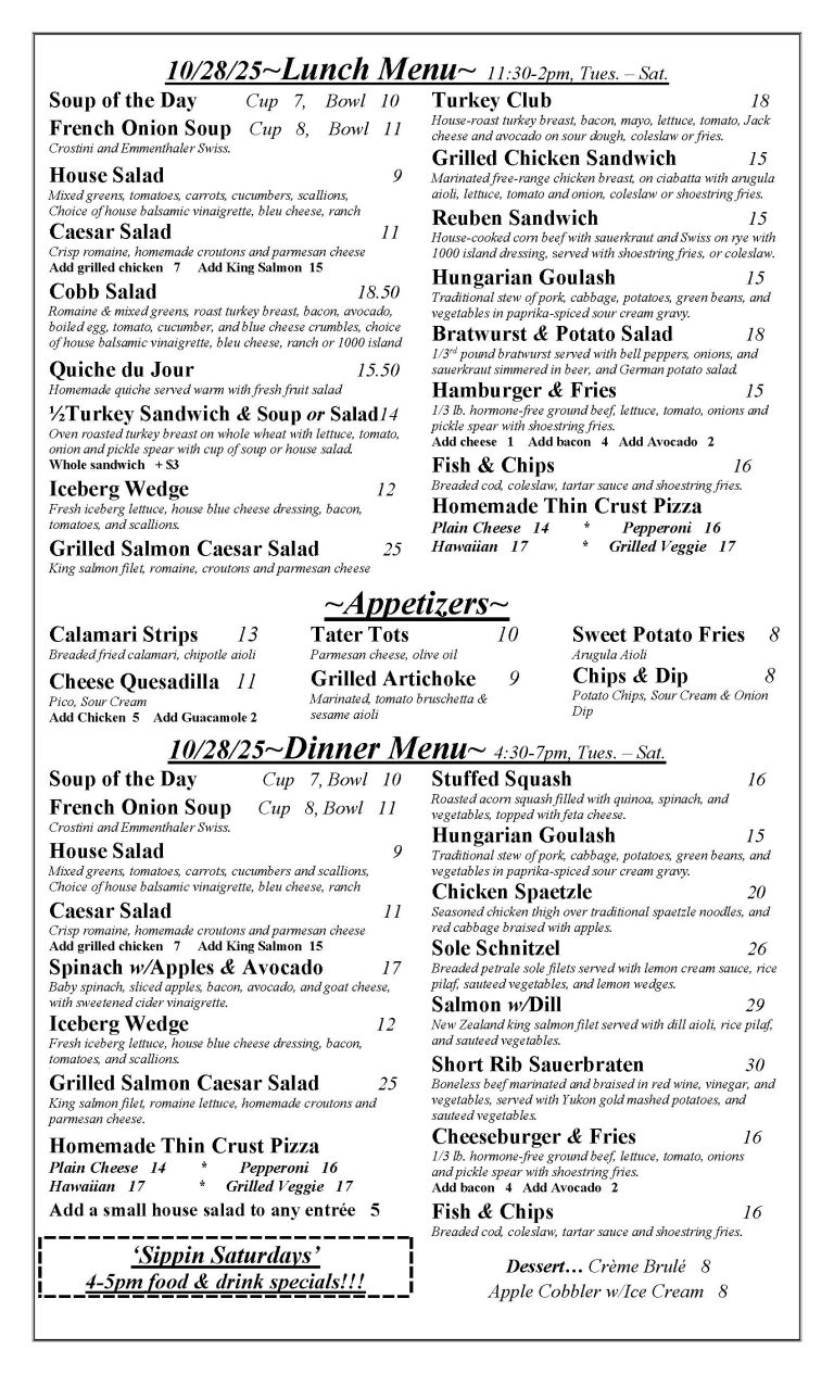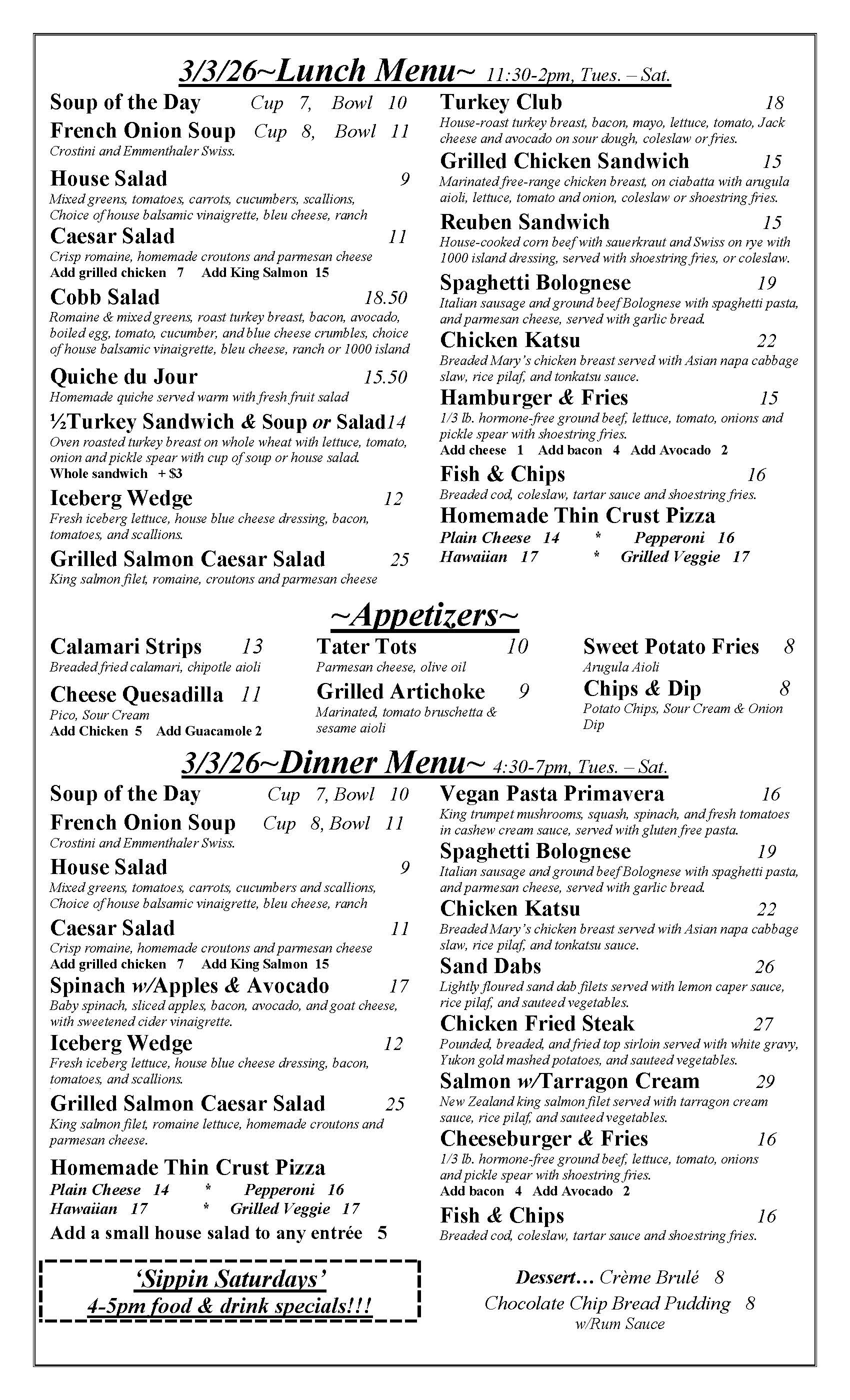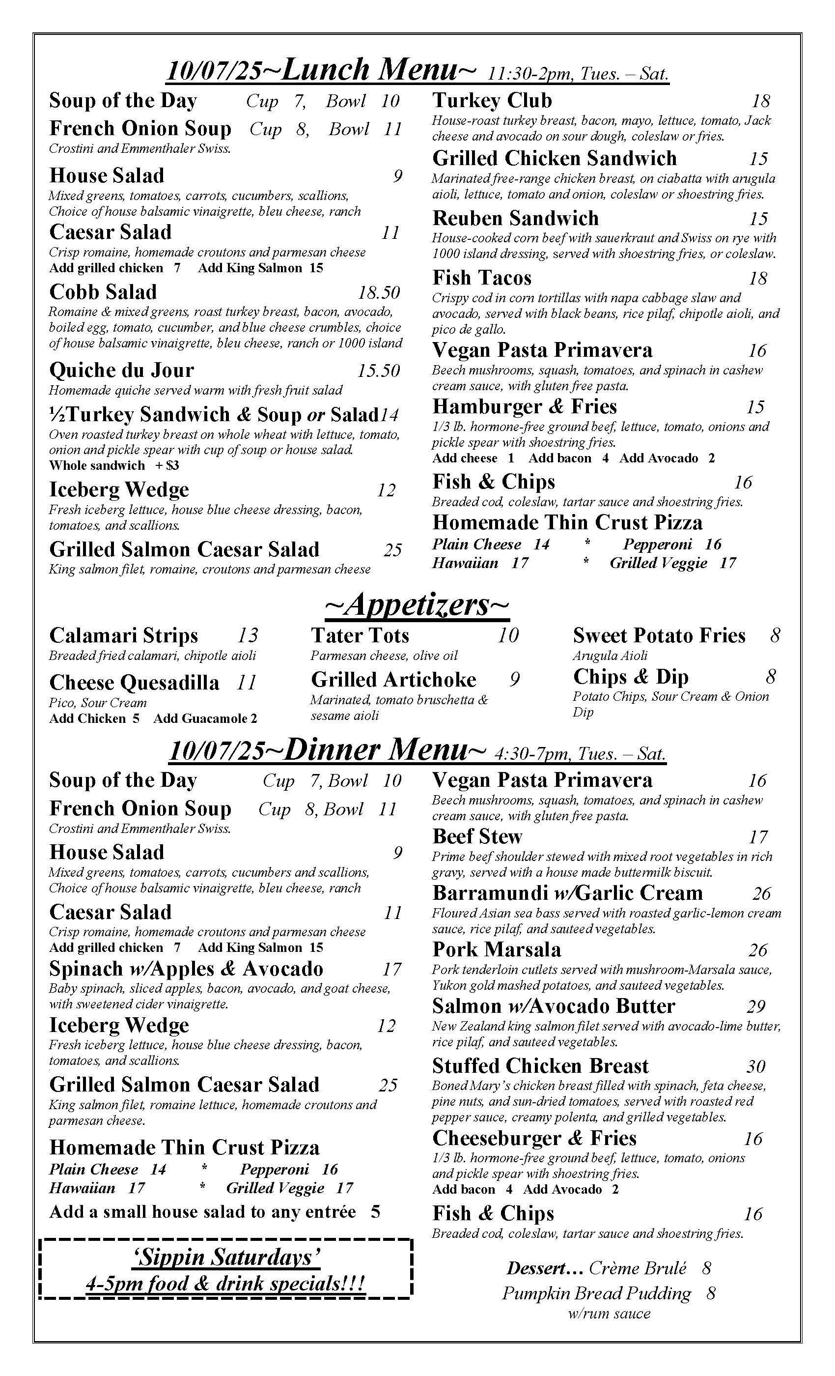Open Tuesday through Saturday for lunch and dinner and Sunday for brunch. Food may also be ordered “to go” for pick-up from the Dining Room or you may request delivery to your unit at no additional cost.